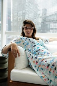 Katie-Sturino-at-the-Pool-Man-Repeller---11 Suit and Sky High Tassel Robe by Robyn Lawley, Karen Walker Sunnies; photo courtesy of Man Repeller.